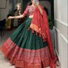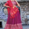 Elegant Tussar Silk Lehenga Set featuring vibrant Patola print with foil work. Includes a stitched lehenga with can-can, unstitched blouse, and printed dupatta. Perfect for festive and wedding occasions.