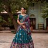 Elegant Tussar Silk Lehenga Set featuring vibrant Patola print with foil work. Includes a stitched lehenga with can-can, unstitched blouse, and printed dupatta. Perfect for festive and wedding occasions.